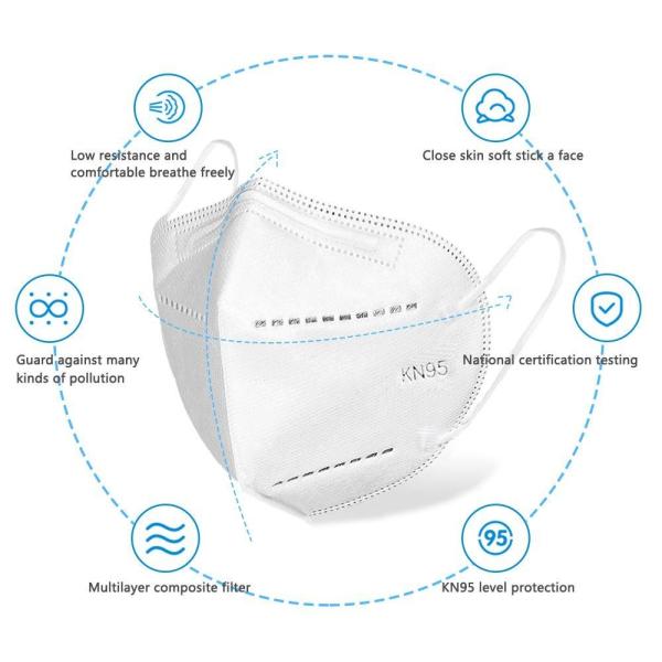 1, Our KN95 face mask is protective and high filter efficiency. The outermost 1 layer non-woven fabric can filter large particles, middle 2-layer melt-blown fabric can block more then 95% particles, 1 layer hot air cotton can filter pm2.5 and the innermost 1 layer non-woven fabric is skin-friendly and softer that give you the comfortable usage experience at the same time it protects your breath with high filter efficiency.
